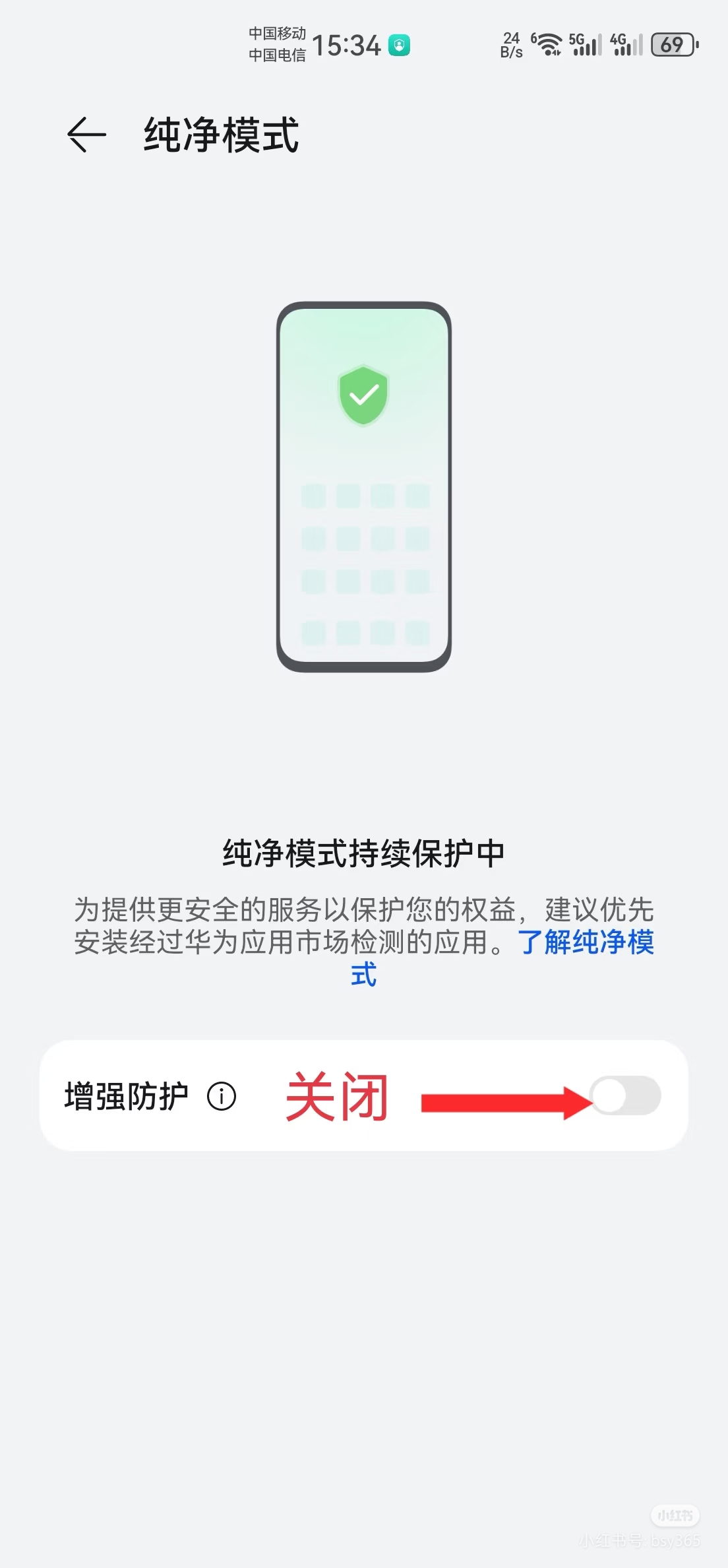 第二步:手机设置→搜索栏搜索“增强防护”或者搜索“纯净模式”(系统和更新--纯净模式)→向左拉 关闭增强防护,也就是“关闭纯净模式”。