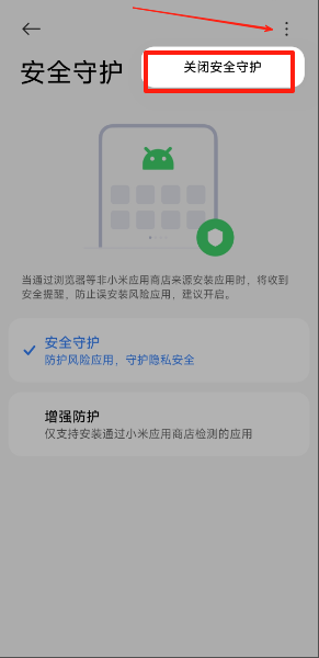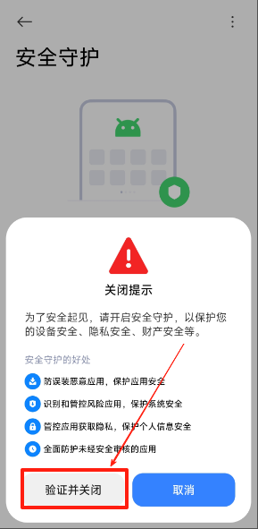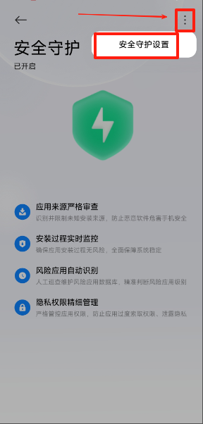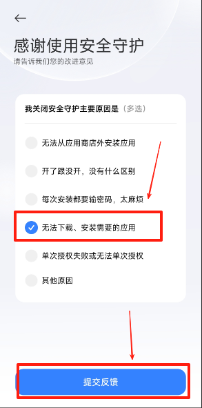 第一步:手机设置→隐私与安全→右上角“安全”→安全守护→点右上角三点“安全守护设置”→点右上角三点“关闭安全守护”→验证并关闭→按验证指纹或者屏幕密码→“无法下载安装需要的应用”→提交反馈。下面有配图。